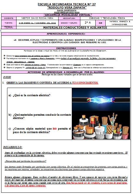 2º A CIENCIAS Y TECNOLOGÍA (FÍSICA) MTRO. NÉSTOR DAVID ROCHA ACTIVIDADES ENERO SEGUNDO GRADO TURNO MATUTINO
